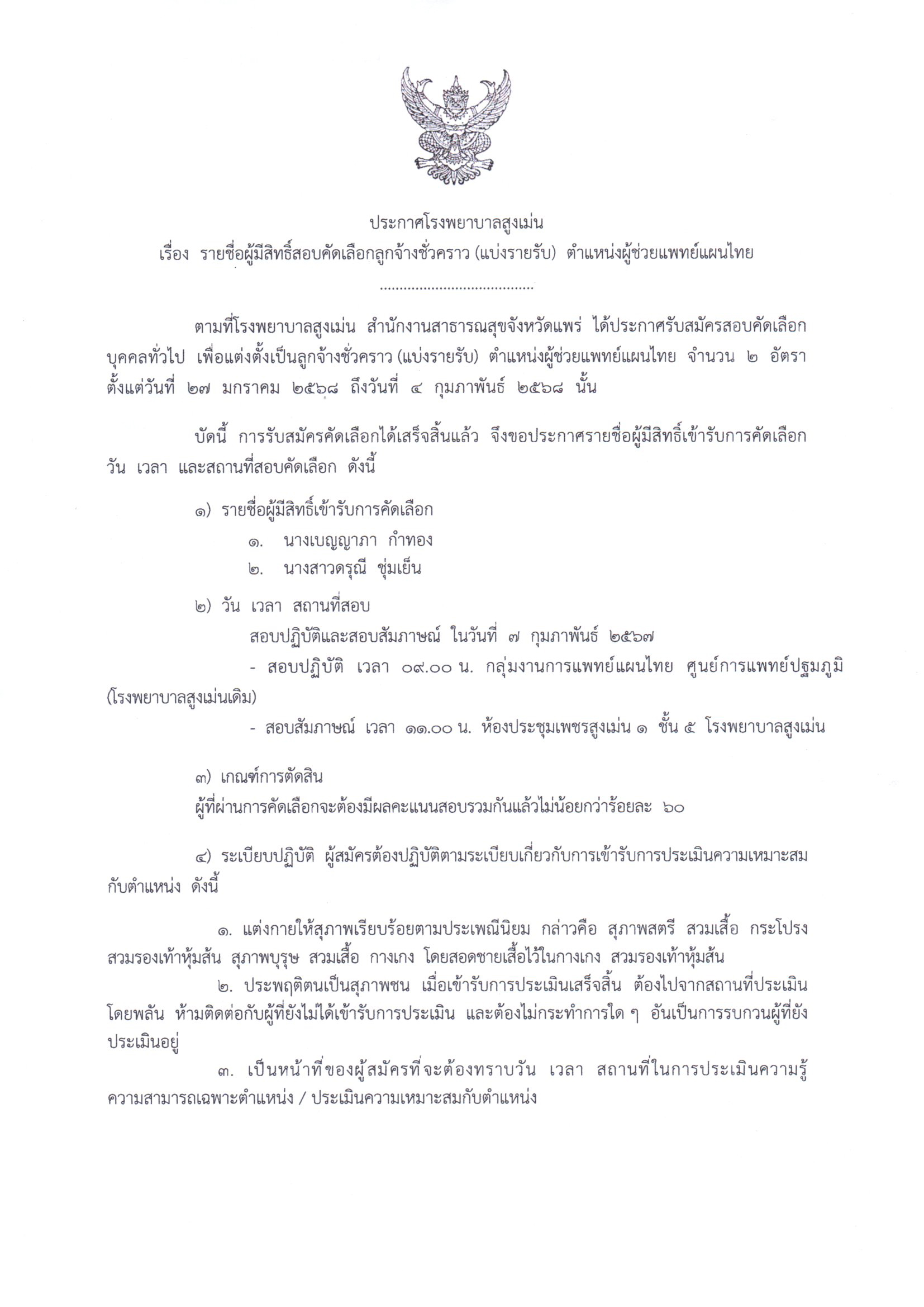 ประกาศรายชื่อผู้มีสิทธิ์สอบคัดเลือกลูกจ้างชั่วคราว (แบ่งรายรับ) ตำแหน่งผู้ช่วยแพทย์แผนไทย