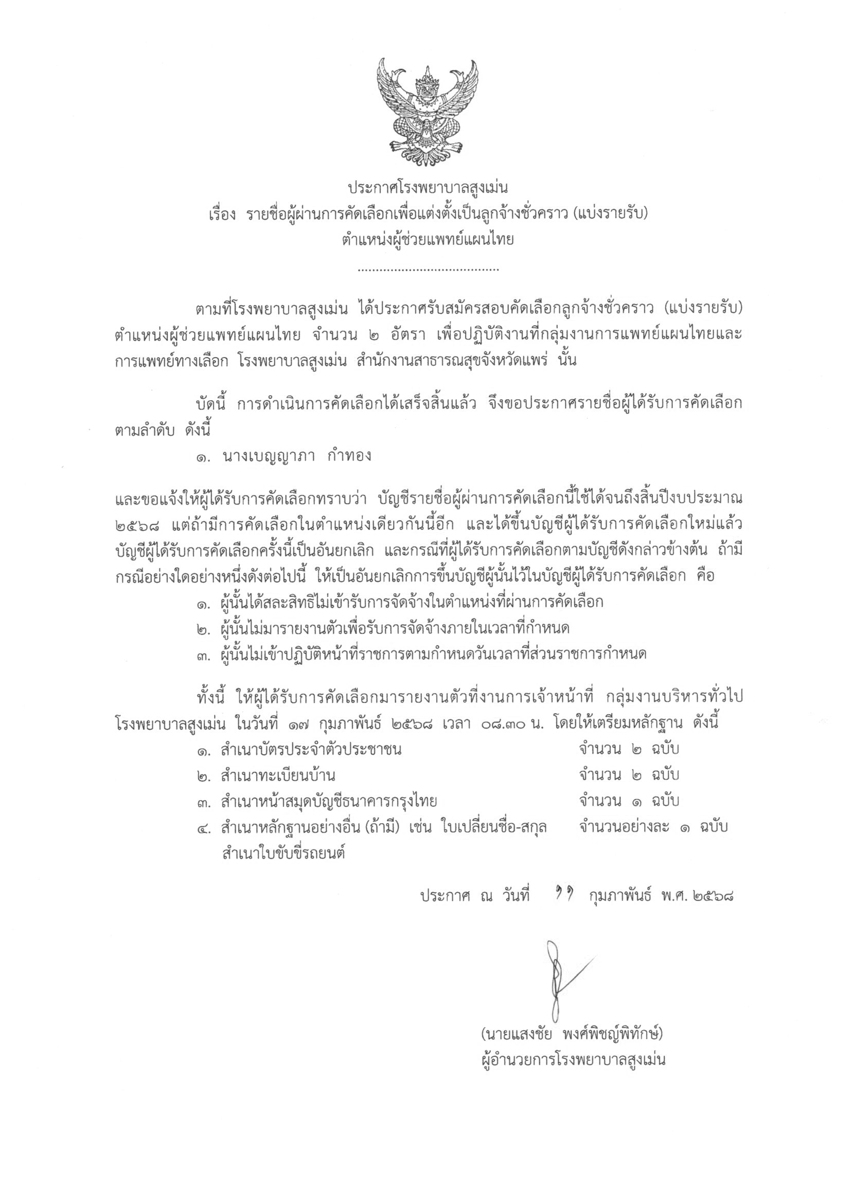 ประกาศรายชื่อผู้ผ่านการคัดเลือกเพื่อแต่งตั้งเป็นลูกจ้างชั่วคราว (แบ่งรายรับ) ตำแหน่งผู้ช่วยแพทย์แผนไทย จำนวน 2 อัตรา