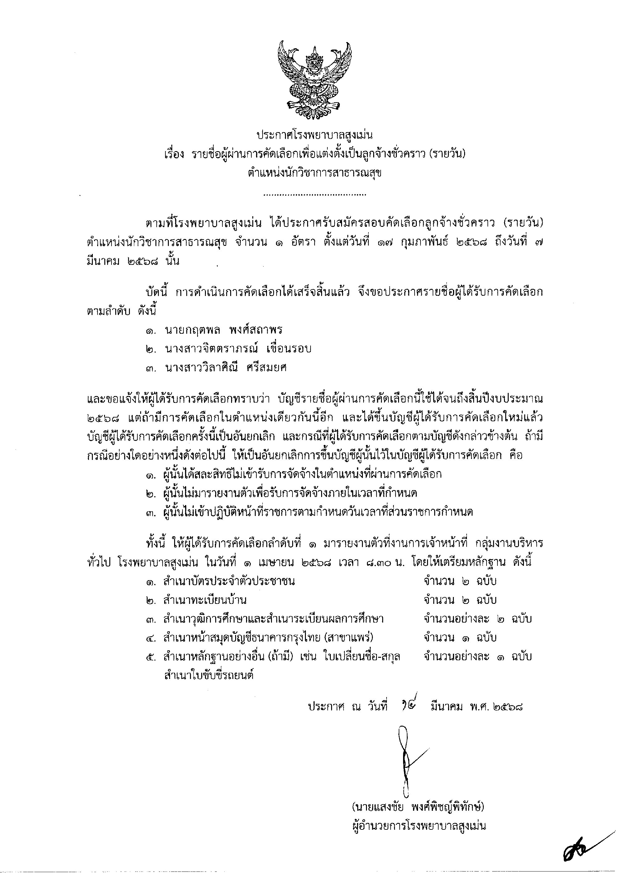 ประกาศรายชื่อผู้ผ่านการคัดเลือกเพื่อแต่งตั้งเป็นลูกจ้างชั่วคราว (รายวัน) ตำแหน่งนักวิชาการสาธารณสุข จำนวน 1 อัตรา