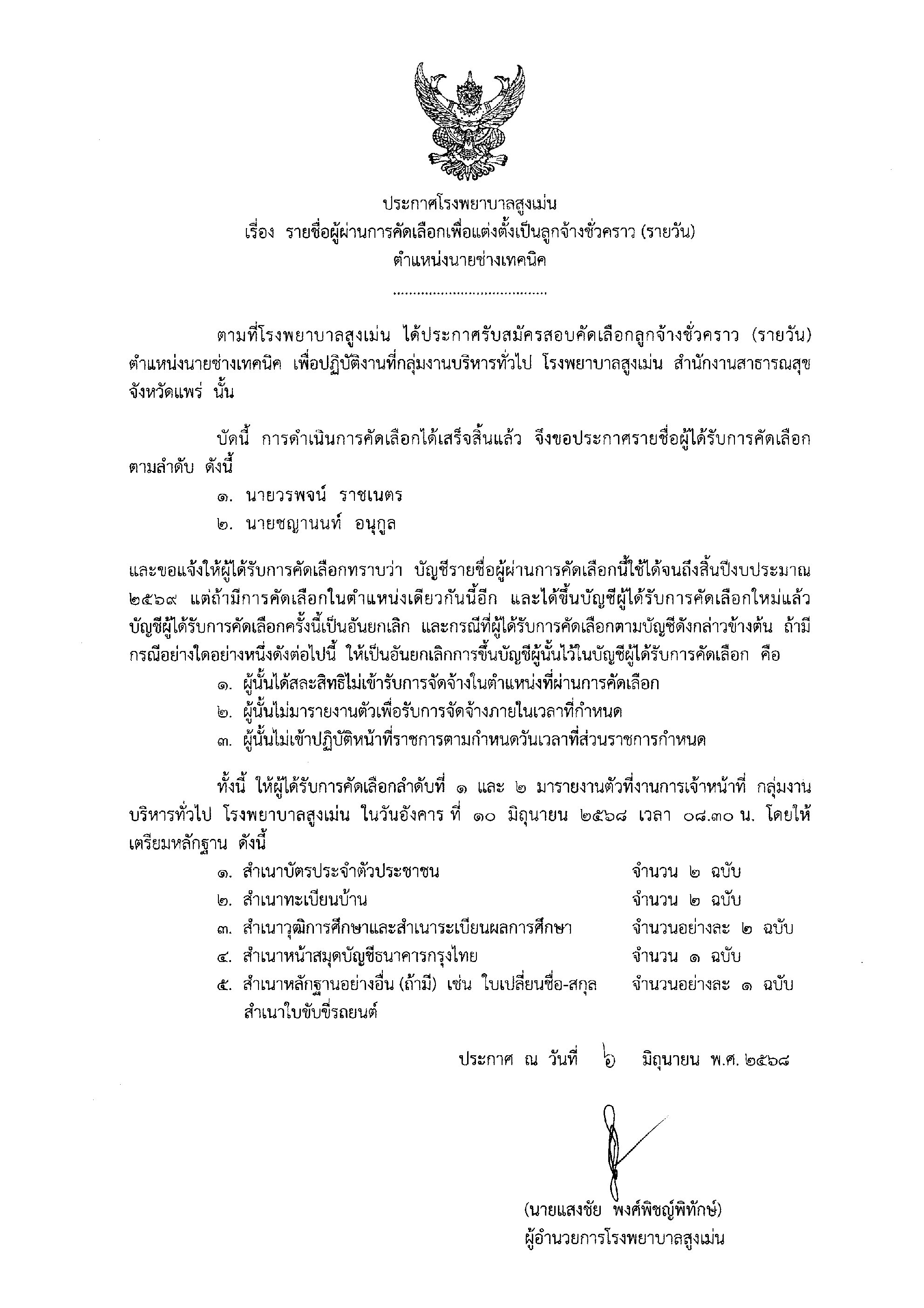 ประกาศรายชื่อผู้ผ่านการคัดเลือกเพื่อแต่งตั้งเป็นลูกจ้างชั่วคราว (รายวัน) ตำแหน่งนายช่างเทคนิค จำนวน 1 อัตรา