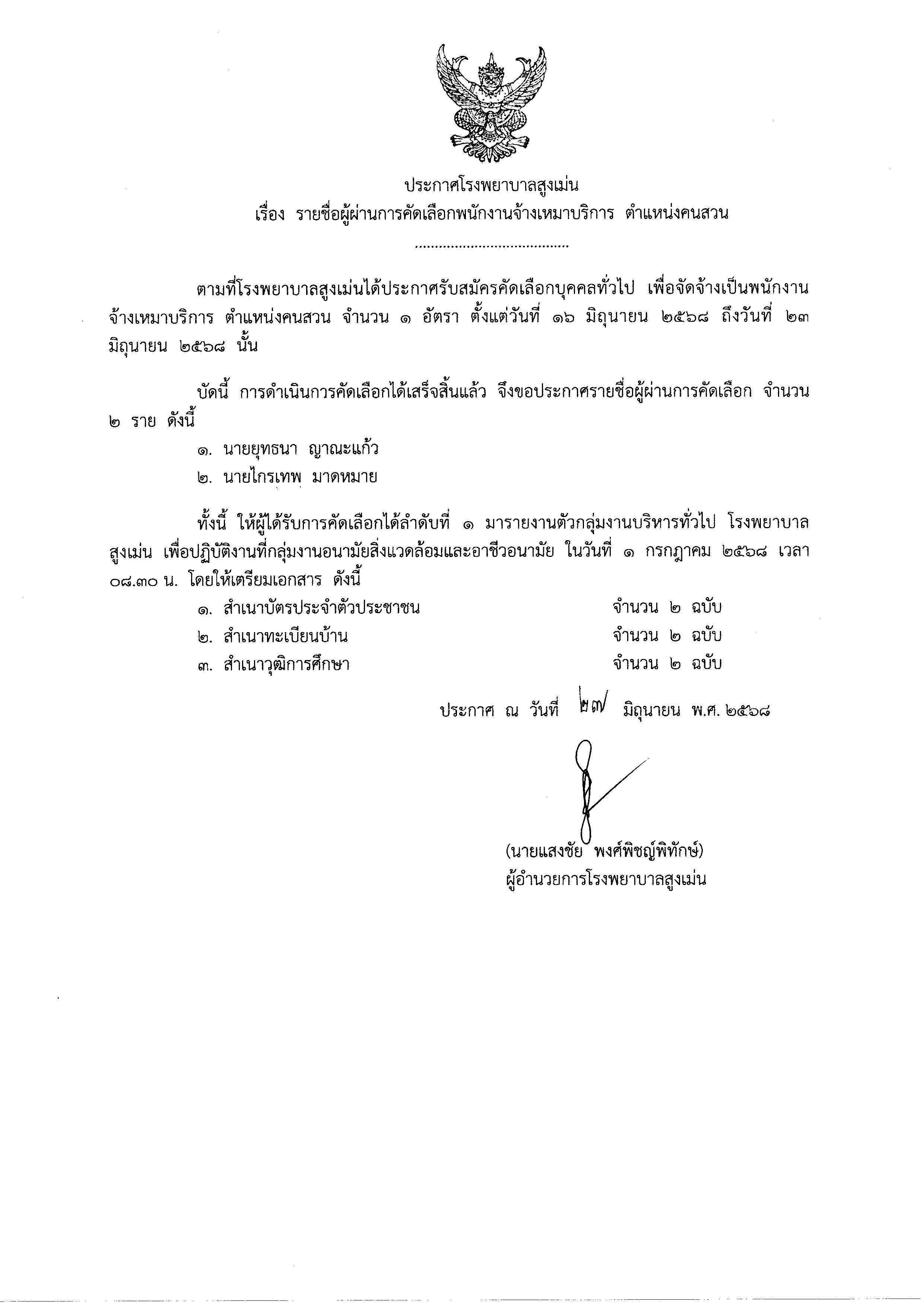 ประกาศรายชื่อผู้ผ่านการคัดเลือกพนักงานจ้างเหมาบริการ ตำแหน่งคนสวน จำนวน 1 อัตรา