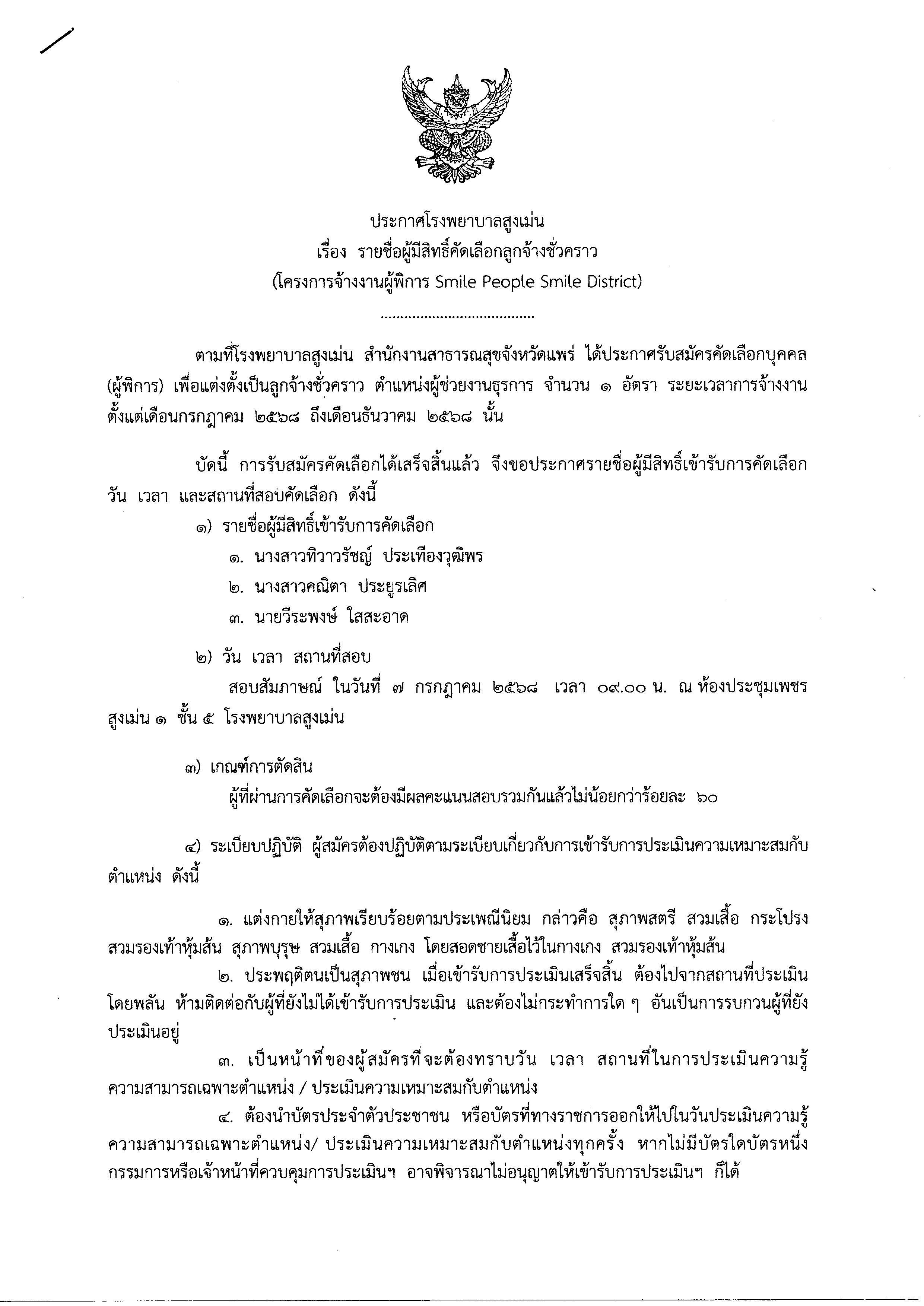 ประกาศรายชื่อผู้มีสิทธิ์สอบคัดเลือกลูกจ้างชั่วคราว (ตามโครงการจ้างงานผู้พิการ Smile People Smile District) จำนวน 1 อัตรา
