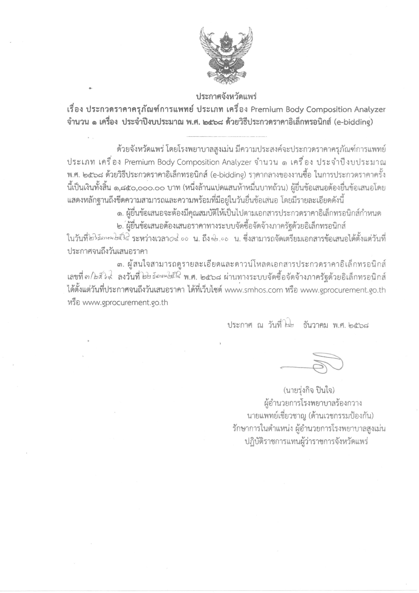ประกาศจังหวัดแพร่ เรื่อง ประกวดราคาครุภัณฑ์การแพทย์ ประเภท เครื่อง Premium Body Composition Analyzer จำนวน ๑ เครื่อง ประจำปีงบประมาณ พ.ศ. ๒๕๖๘ ด้วยวิธีประกวดราคาอิเล็กหรอนิกส์ (e-bidding)