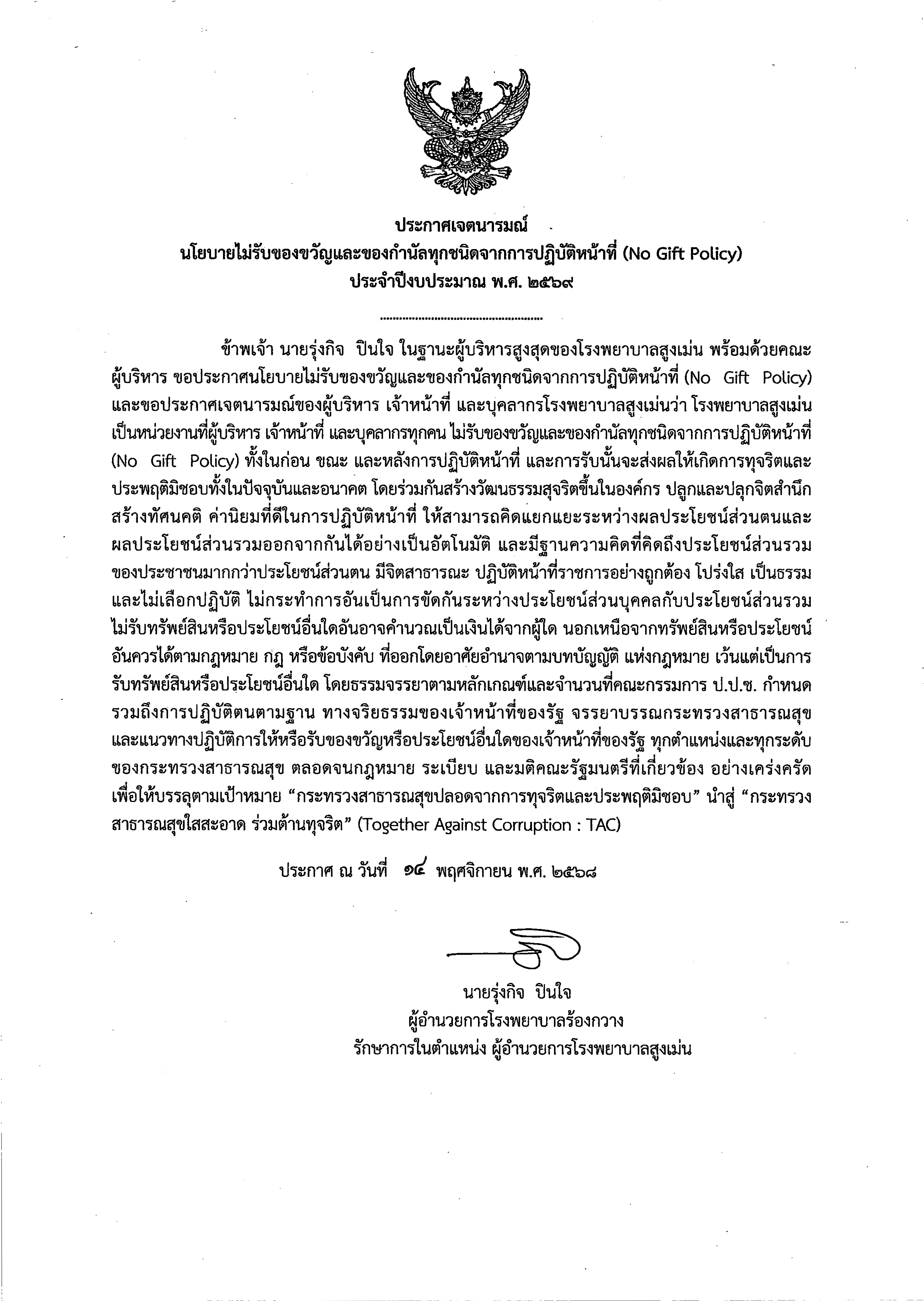 ประกาศเจตนารมณ์ นโยบายไม่รับของขวัญและของกำนัลทุกชนิดจากการปฏิบัติหน้าที่ (No Gift Policy) ประจำปีงบประมาณ พ.ศ. ๒๕๖๙