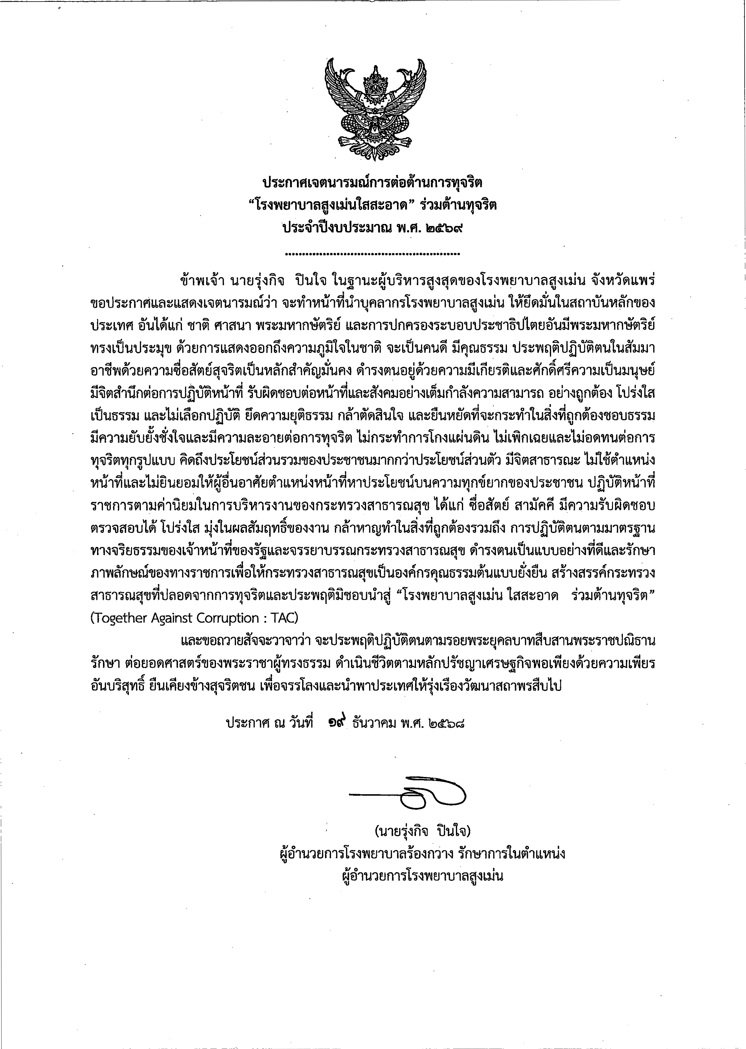 ประกาศเจตนารมณ์การต่อต้านการทุจริต "โรงพยาบาลสูงเม่นใสสะอาด" ร่วมต้านทุจริต ประจำปีงบประมาณ พ.ศ. ๒๕๖๙