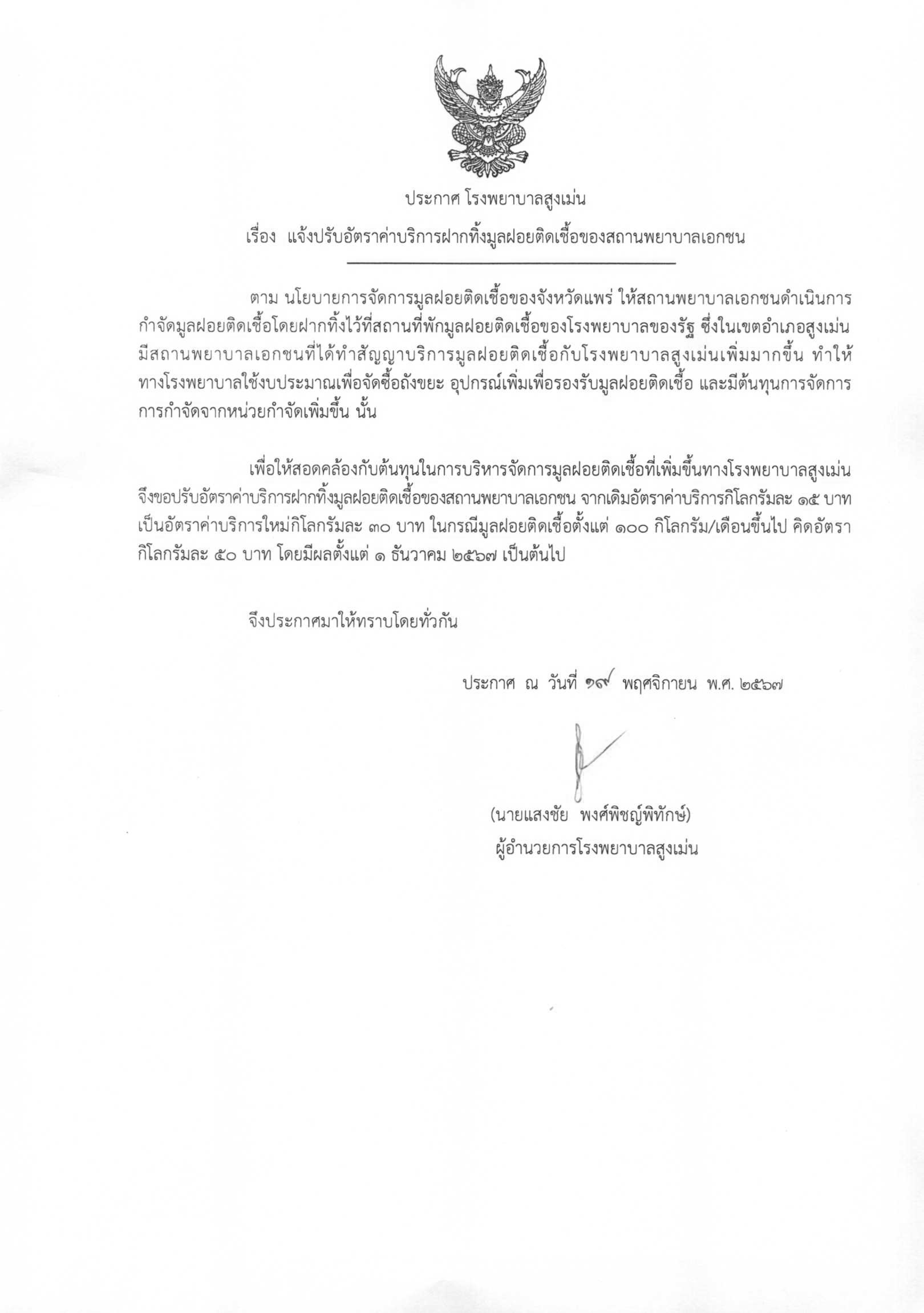 ประกาศแจ้งปรับอัตราค่าบริการฝากทิ้งมูลฝอยติดเชื้อของสถานพยาบาลเอกชน