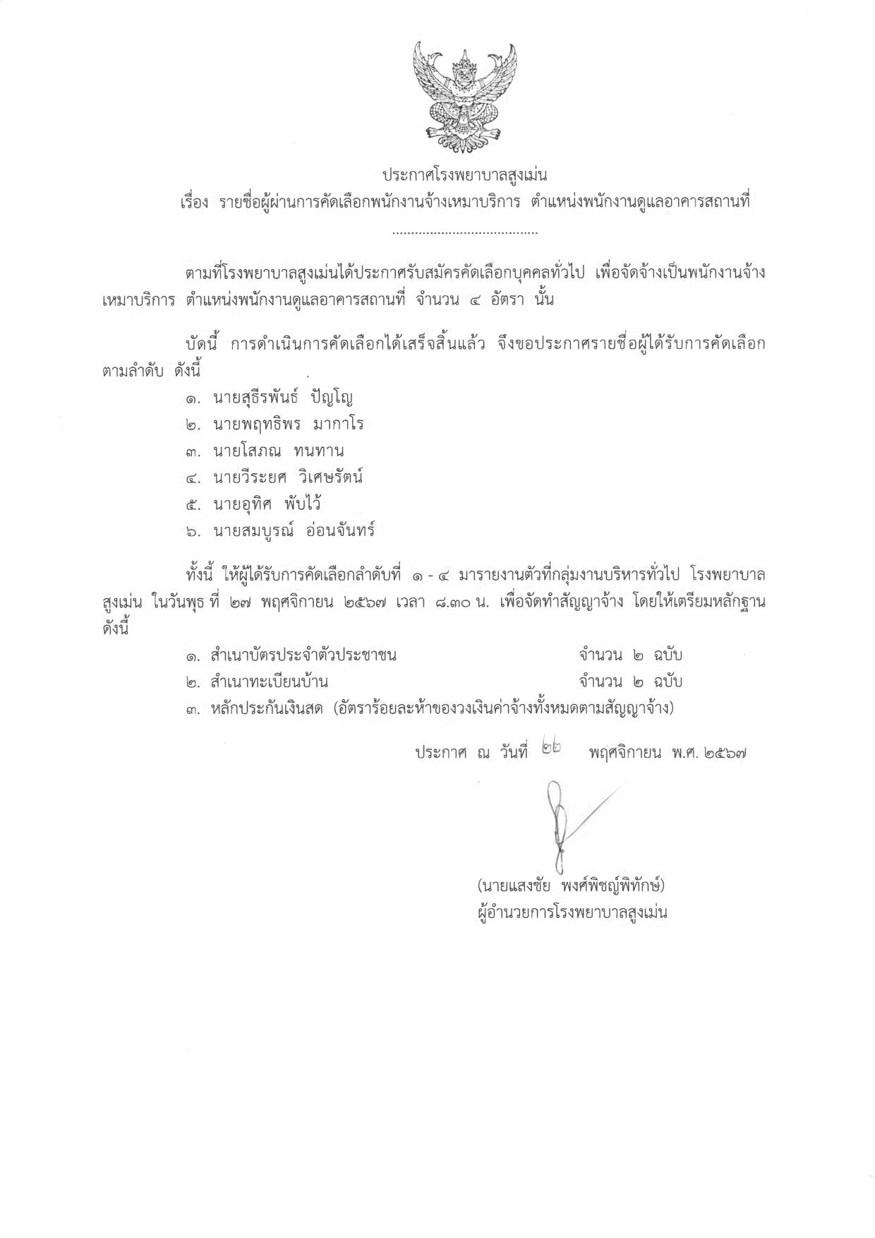 ประกาศรายชื่อผู้ผ่านการคัดเลือกพนักงานจ้างเหมาบริการ ตำแหน่งพนักงานดูแลอาคารสถานที่